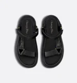 The D-Wave sandal highlights a hybrid silhouette with a modern aesthetic. The style has black lambskin straps enhanced by the gold-tone Christian Dior Paris signature on the side. Completed by an ultralightweight and comfortable notched EVA sole, the sandal will lend a contemporary touch to any of the season’s looks.