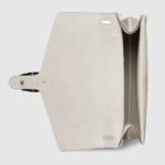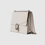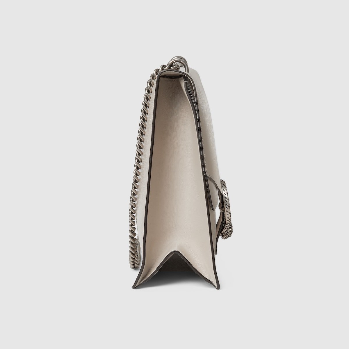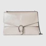 Gucci presents a maxi version of the signature Dionysus shoulder bag. Designed with a more contemporary look, this iteration in sleek light grey patent leather features a tiger head closure with a flap and a sliding chain that can be adjusted to wear with the preferred length and style.