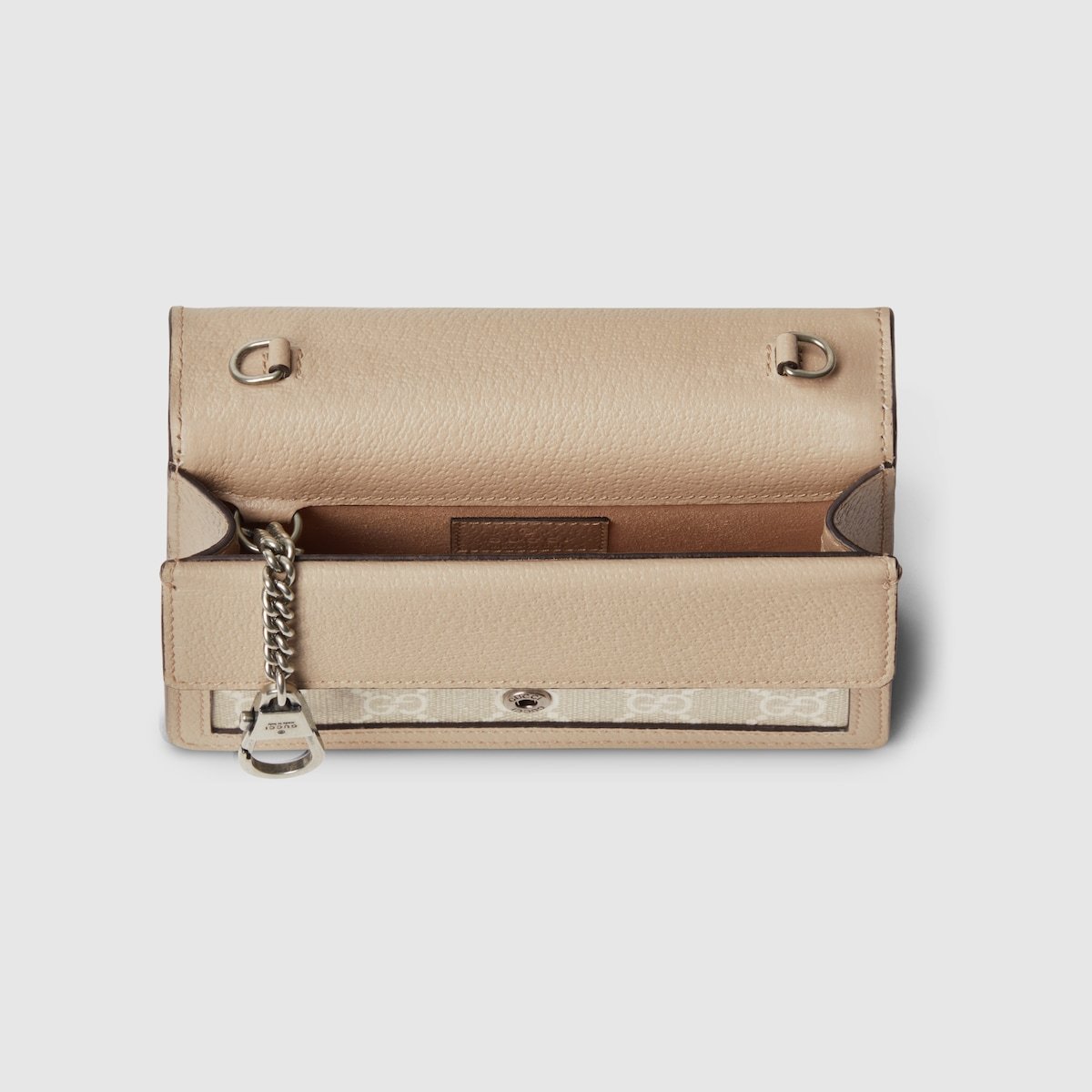 A new edition of the Dionysus is showcased throughout Gucci Love Parade. The bag is presented in a super mini size in an evolution of the classic GG Supreme canvas. A soft color palette, the petite design takes on a refined feel in the colors of beige and white, drawing attention to its recognizable tiger head hardware.