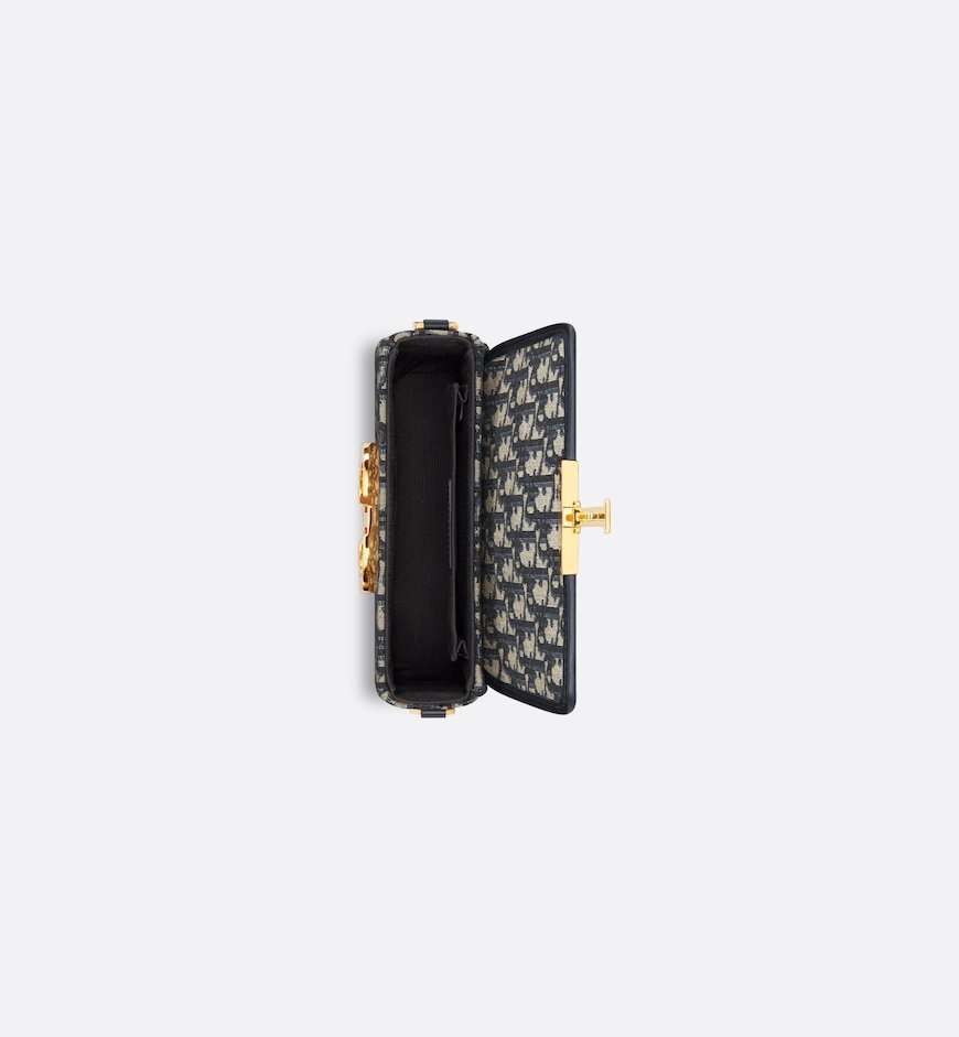 The 30 Montaigne line, inspired by the historic, emblematic address, presents essential pieces that portray the iconic codes of the House. The compact bag is crafted in blue Dior Oblique jacquard for an elegant and modern look. The flap is embellished with an antique gold-finish metal CD clasp, inspired by the seal of a Christian Dior perfume bottle. Refined details such as an embossed 30 Montaigne signature on the back and the military-inspired buckle define this unique design. Featuring an adjustable leather shoulder strap, the 30 Montaigne box bag may be carried by hand, worn over the shoulder or crossbody.