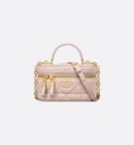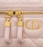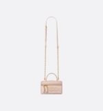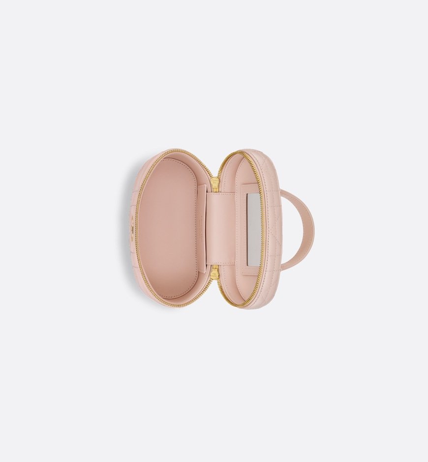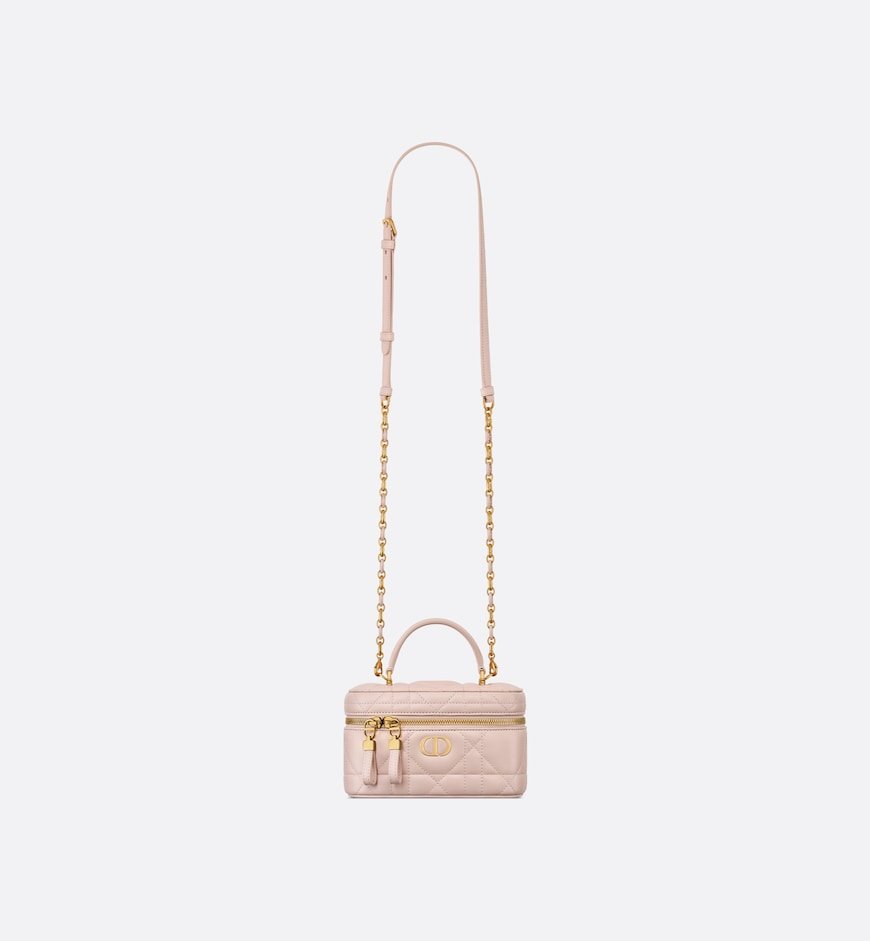 New for Summer 2024, the Dior Caro mini vanity case enhances the line with a compact design that is both functional and refined. Crafted in powder pink lambskin, it stands out with the original quilted effect of the Macrocannage stitching, as well as a CD signature on the front. The vanity case will accommodate the essentials and is completed by a pocket and interior mirror. It can be carried by hand using the handle or worn over the shoulder or crossbody using the adjustable and removable chain strap with alternating links in gold-finish metal and powder pink enamel with a leather insert.