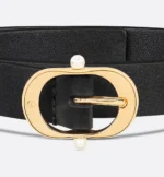 New for Summer 2025, the Dior Chic belt is imbued with timeless elegance. Crafted in black smooth calfskin, it is embellished with a shiny gold-finish metal buckle featuring graceful lines and a CD signature engraving, as well as two white resin pearls. Accenting the waist with refinement, the classic accessory will pair well with jeans, a skirt or dress.