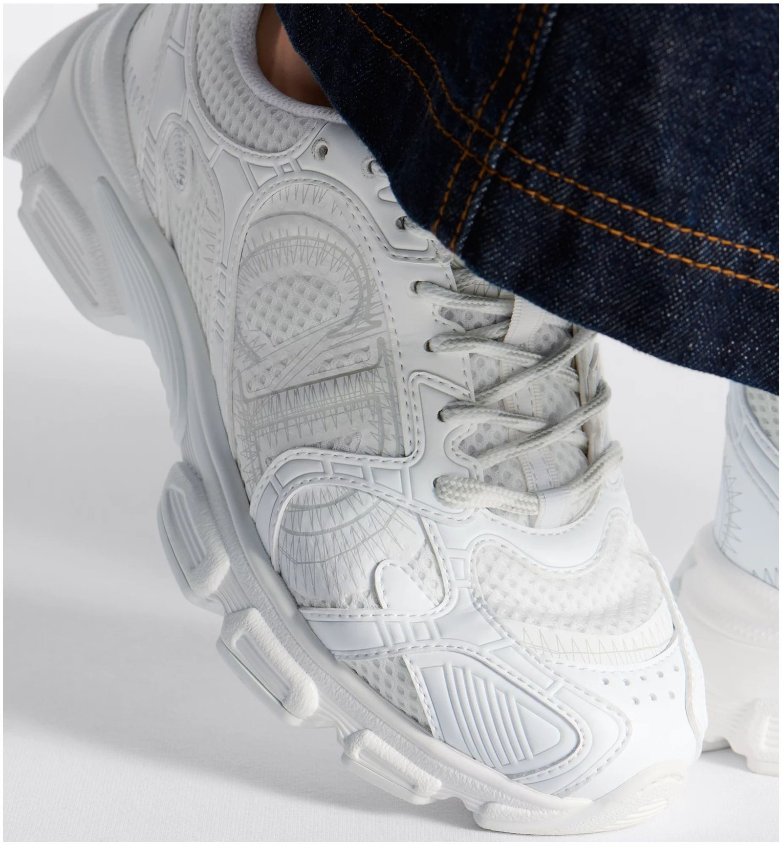 The Dior Chrono sneaker revisits the running shoe with the House’s couture codes. Pairing mesh with white leather-effect panels, it is accented by hallmark detailing like the CD signature on the sides, a star patch on the tongue and a rear Dior signature. Featuring two-tone laces and an ultralightweight sole adorned with a star, the sneaker will complete laid-back outfits year-round.