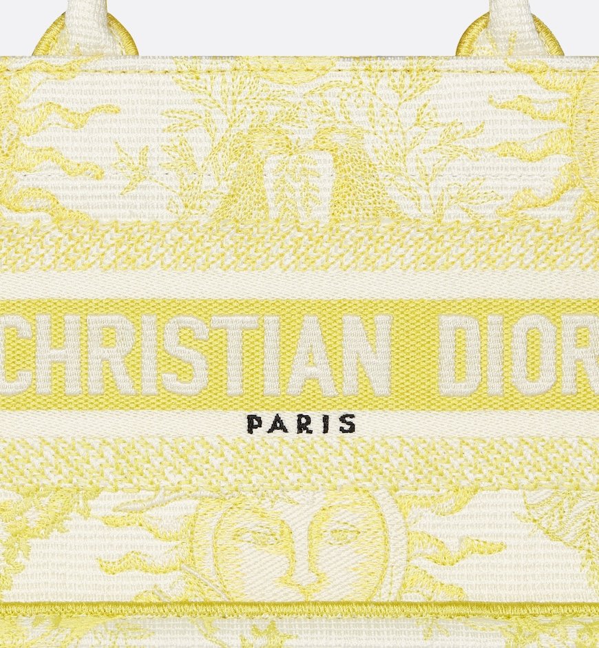 Part of the Dioriviera capsule, Maria Grazia Chiuri’s newest Dior Book Tote is updated with a new East-West format. The style is entirely embroidered with the Toile de Jouy Soleil motif in lemon yellow, offering a new take on the iconic House pattern with suns and crescent moons layered into a floral arrangement representing the four seasons. Designed to keep daily items organized, the practical tote is a prime example of Dior’s savoir-faire and can be carried by hand or worn over the shoulder.