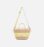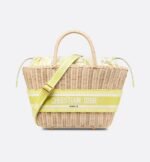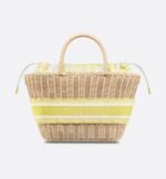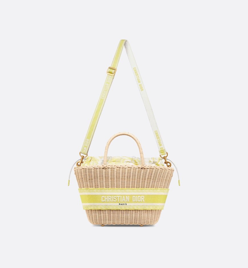 Part of the Dioriviera capsule, the hat basket bag stands out with its elegant silhouette combining functionality and refinement. A testament to House savoir-faire, the bag is hand-woven using artisanal techniques in natural wicker. The style features wicker top handles and a lemon yellow Toile de Jouy jacquard interior drawstring pouch. The Christian Dior Paris signature adorns the front. Equipped with a removable tonal zip pouch, the spacious bag is completed by an adjustable and removable embroidered shoulder strap that allows it to be carried by hand, worn over the shoulder or crossbody.