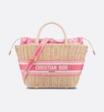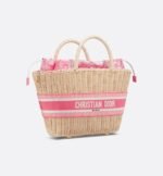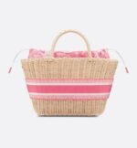 Part of the Dioriviera capsule, the hat basket bag stands out with its elegant silhouette combining functionality and refinement. A testament to House savoir-faire, the bag is hand-woven using artisanal techniques in natural wicker. The style features wicker top handles and a candy pink Toile de Jouy jacquard interior drawstring pouch. The Christian Dior Paris signature adorns the front. Equipped with a removable tonal zip pouch, the spacious bag is completed by an adjustable and removable embroidered shoulder strap that allows it to be carried by hand, worn over the shoulder or crossbody.
