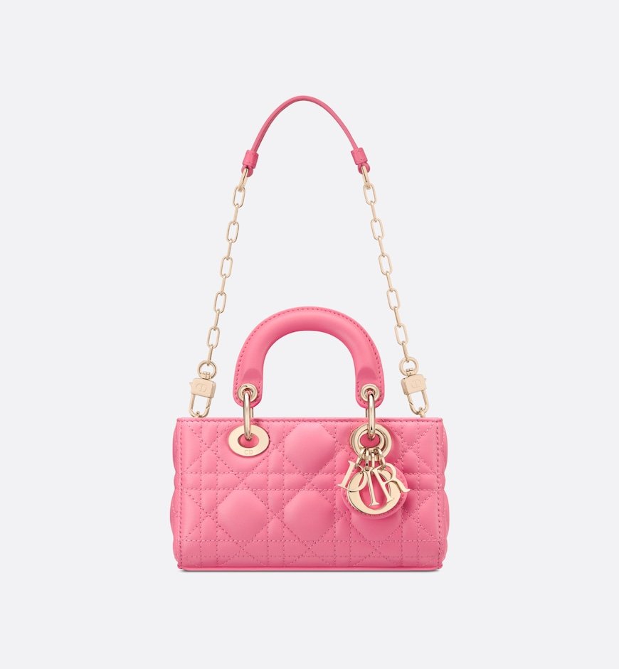 Part of the Dioriviera capsule, the Lady D-Joy micro bag captures the House’s vision of elegance and beauty by showcasing the streamlined aesthetic of the iconic Lady Dior line. Sleek and refined, the timeless creation is crafted in candy pink lambskin with Cannage topstitching and enhanced by a pale gold-finish metal D.I.O.R. charm. Featuring one removable chain strap and another adjustable and removable leather strap, the Lady D-Joy bag can be carried by hand, worn over the shoulder or crossbody as an ideal day or evening companion.