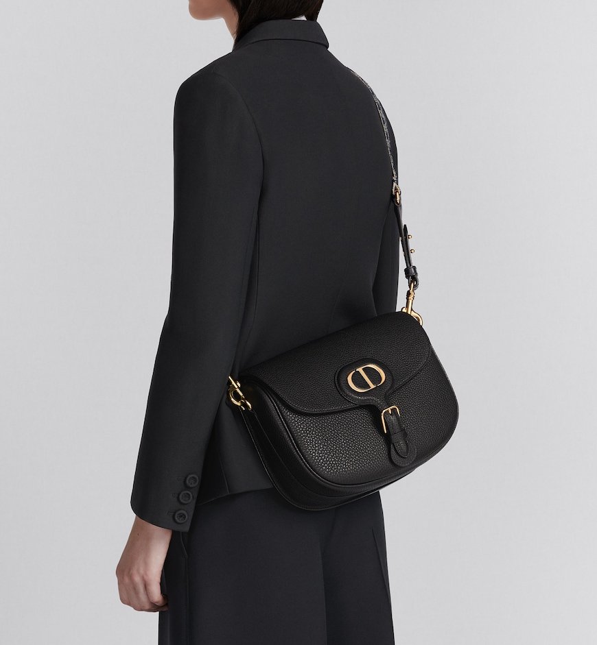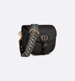 The Dior Bobby bag is a hobo style showcasing sophisticated lines and harmonious proportions. This black style is crafted from very supple natural grained calfskin with a suede calfskin interior, and is enhanced by antique gold-finish metal hardware. Its wide blue Dior Oblique embroidered removable and adjustable strap allows the large Dior Bobby bag to be carried by hand, worn over the shoulder or crossbody.
