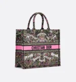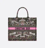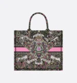 Introduced by Maria Grazia Chiuri, Creative Director of Christian Dior, the Dior Book Tote has become a staple of the Dior aesthetic. Designed to hold all the daily essentials, the black style is fully embroidered with Pietro Ruffo’s multicolor Dior Around the World motif, showcasing a star decorated with flowers in honor of Scottish heritage, the collection’s hallmark theme, and an allegory of the senses with a Mary Stuart quote:‘En ma fin est mon commencement’ (In my end is my beginning). Adorned with the Christian Dior Paris signature on the front, the large tote is a prime example of Dior’s savoir-faire and can be carried by hand or worn over the shoulder. The bag can be coordinated with the season’s other Dior Around the World creations.