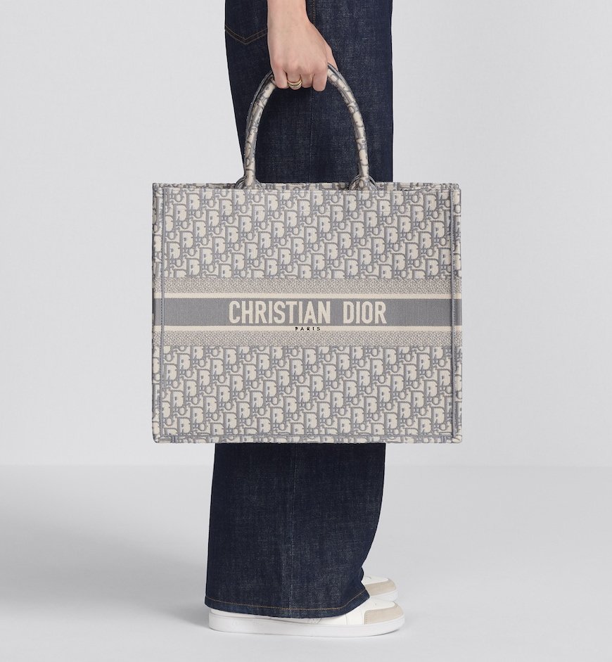 Introduced by Maria Grazia Chiuri, Creative Director of Christian Dior, the Dior Book Tote has become a staple of the Dior aesthetic. Designed to hold all the daily essentials, the style is fully embroidered with the ecru and gray hallmark Dior Oblique motif. Adorned with the Christian Dior Paris signature on the front, the large tote exemplifies the House’s signature savoir-faire and may be carried by hand or worn over the shoulder.