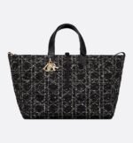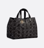 The Dior Toujours bag is distinguished by a casual and practical design. Fully embroidered with black textured tweed, it is accented by a blend of threads displaying the Cannage motif. It showcases a spacious interior compartment with a matching pouch to organize the essentials, while a leather strap closure keeps items secure and the D of the CD Lock clasp twists to adjust the sides and enhance the bag’s silhouette. The leather handles can be adjusted using the small notches in order to be able to carry the large bag by hand or wear it over the shoulder.