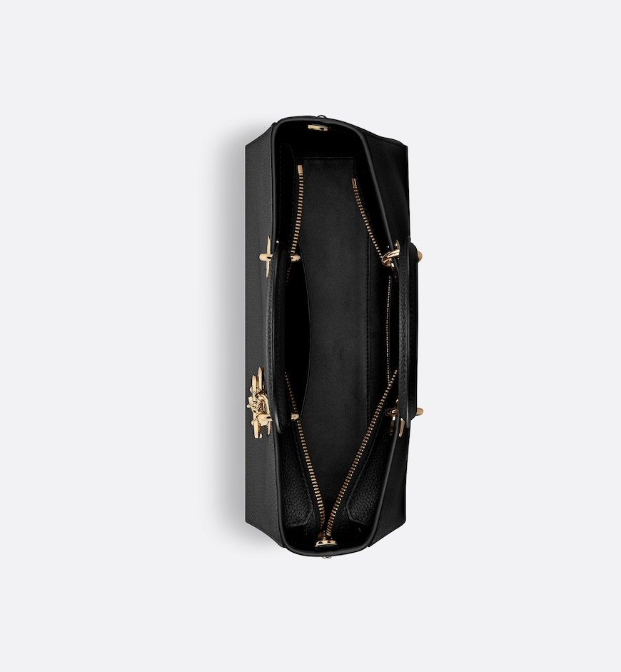 New for Summer 2024, the Lady D-Sire bag draws inspiration from the signature elegance of the Lady Dior design. Reimagined with a casual style for an urban look, the lightweight black grained Taurillon leather feels soft to the touch yet offers excellent durability. The large style is embellished with pale gold-finish metal D.I.O.R. charms highlighting the silhouette. Showcasing a removable, thin leather shoulder strap, the unique bag can be carried by hand or over the shoulder.