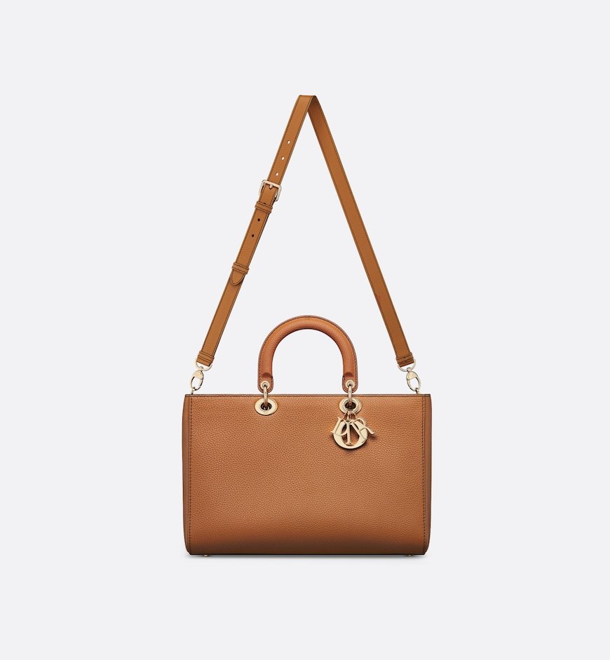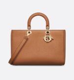 New for Summer 2024, the Lady D-Sire bag draws inspiration from the signature elegance of the Lady Dior design. Reimagined with a casual style for an urban look, the lightweight dark brandy grained Taurillon leather feels soft to the touch yet offers excellent durability. The large style is embellished with pale gold-finish metal D.I.O.R. charms highlighting the silhouette. Showcasing a removable, thin leather shoulder strap, the unique bag can be carried by hand or over the shoulder.