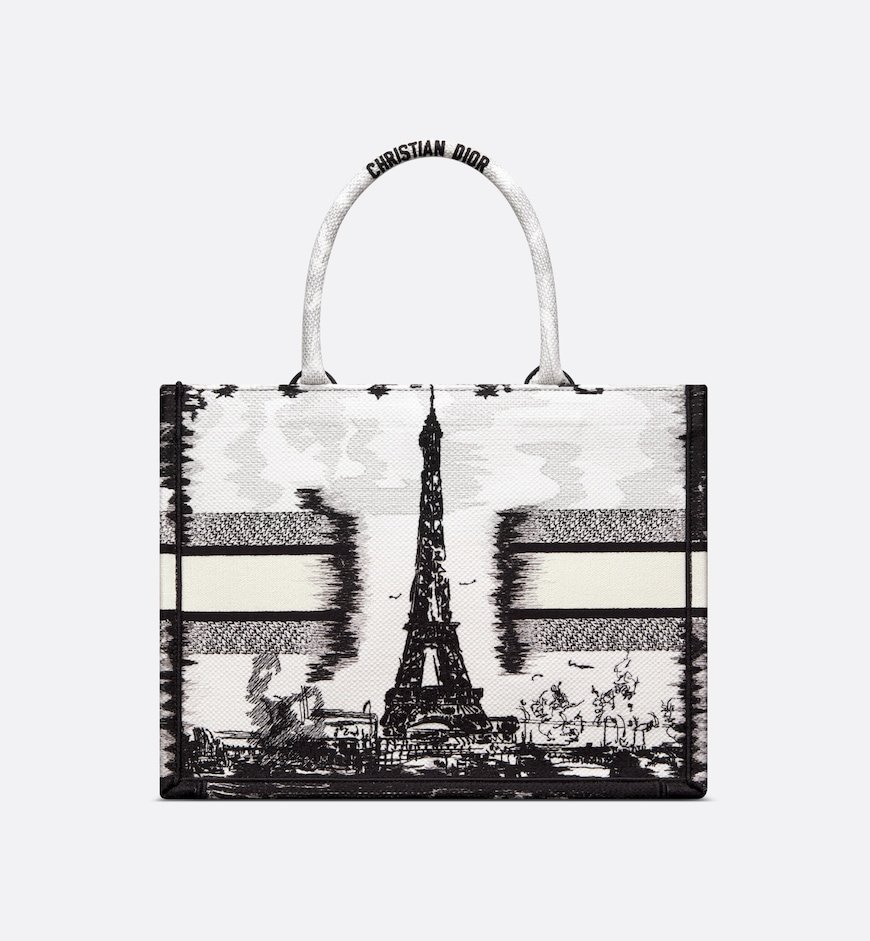 Introduced by Maria Grazia Chiuri, Creative Director of Christian Dior, the Dior Book Tote has become a staple of the Dior aesthetic. Designed to hold all the daily essentials, the style is fully embroidered with the white and black Paris motif, a pillar of the collection that honors the Eiffel Tower in a graphic spirit. Adorned with the Christian Dior Paris signature on the front, the medium tote exemplifies the House’s savoir-faire and may be carried by hand or worn over the shoulder.