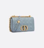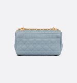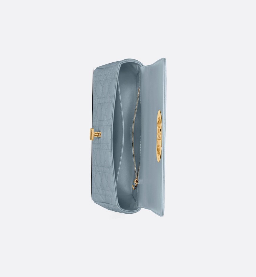 The Dior Caro bag combines modernity with timeless elegance. The style is crafted in cloud blue supple calfskin with Cannage stitching. The bag showcases a flap adorned with an antique gold-finish metal CD twist clasp, inspired by the seal of a Christian Dior perfume bottle. The detachable chain shoulder strap with CD signature links allows the medium bag to be carried by hand, worn over the shoulder or crossbody, and may be replaced by one of the House’s wide embroidered straps for day or evening attire.