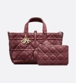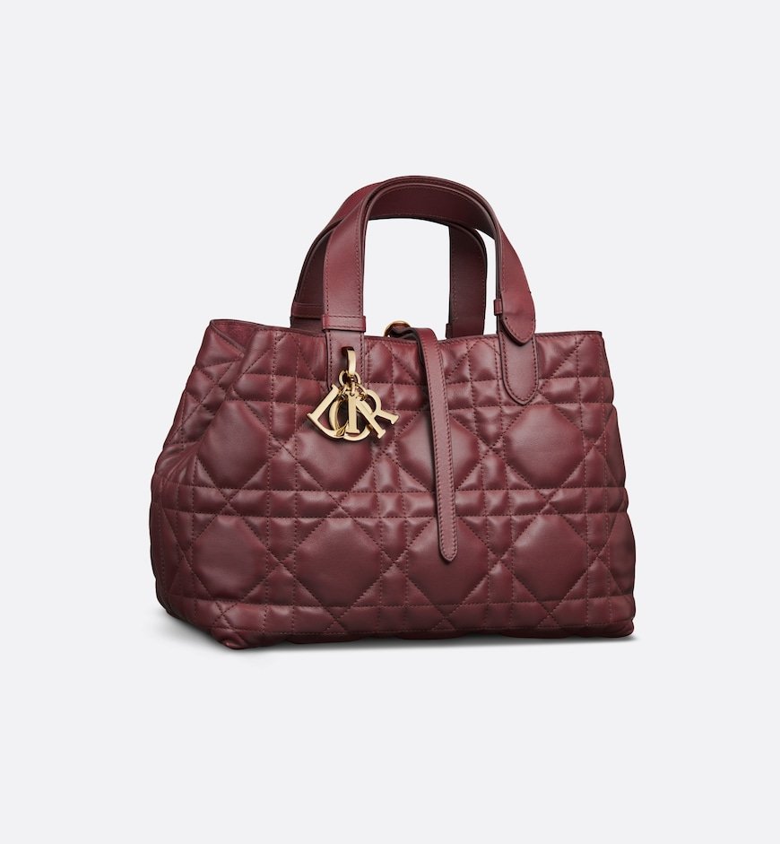 The Dior Toujours bag is distinguished by a casual and practical design. Crafted in burgundy calfskin with Macrocannage topstitching, it showcases a spacious interior compartment with a matching pouch to organize the essentials. Its thin leather strap closure keeps items secure while the D of the CD Lock clasp twists to adjust the sides and enhance the bag’s silhouette. The leather handles can be adjusted using the small notches in order to be able to carry the medium bag by hand or wear it over the shoulder.