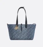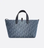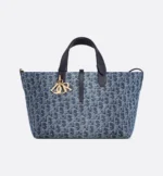 The Dior Toujours bag is distinguished by a casual and practical design. Crafted in blue Denim Dior Oblique jacquard, revisiting the House’s iconic motif in a modern, irregular stonewashed effect, the model showcases a spacious interior compartment with a matching pouch to organize the essentials. Its thin leather strap closure keeps items secure while the D of the CD Lock clasp twists to adjust the sides and enhance the bag’s silhouette. The leather handles can be adjusted using the small notches so the medium bag can be carried by hand or worn over the shoulder.