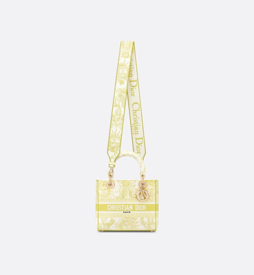 Part of the Dioriviera capsule, the Lady D-Lite bag captures the House’s vision of classic elegance and modernity. It is fully embroidered with the Toile de Jouy Soleil motif in lemon yellow, offering a new take on the iconic House pattern with suns and crescent moons layered into a floral design representing the four seasons. The front is accented by a Christian Dior Paris signature while pale gold-finish metal D.I.O.R. charms embellish and illuminate the silhouette. Featuring a wide, removable embroidered shoulder strap, the medium Lady D-Lite bag can be carried by hand or worn crossbody.