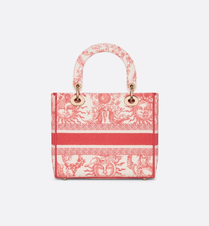 Part of the Dioriviera capsule, the Lady D-Lite bag captures the House’s vision of classic elegance and modernity. It is fully embroidered with the Toile de Jouy Soleil motif in coral, offering a new take on the iconic House pattern with suns and crescent moons layered into a floral design representing the four seasons. The front is accented by a Christian Dior Paris signature while pale gold-finish metal D.I.O.R. charms embellish and illuminate the silhouette. Featuring a wide, removable embroidered shoulder strap, the medium Lady D-Lite bag can be carried by hand or worn crossbody.