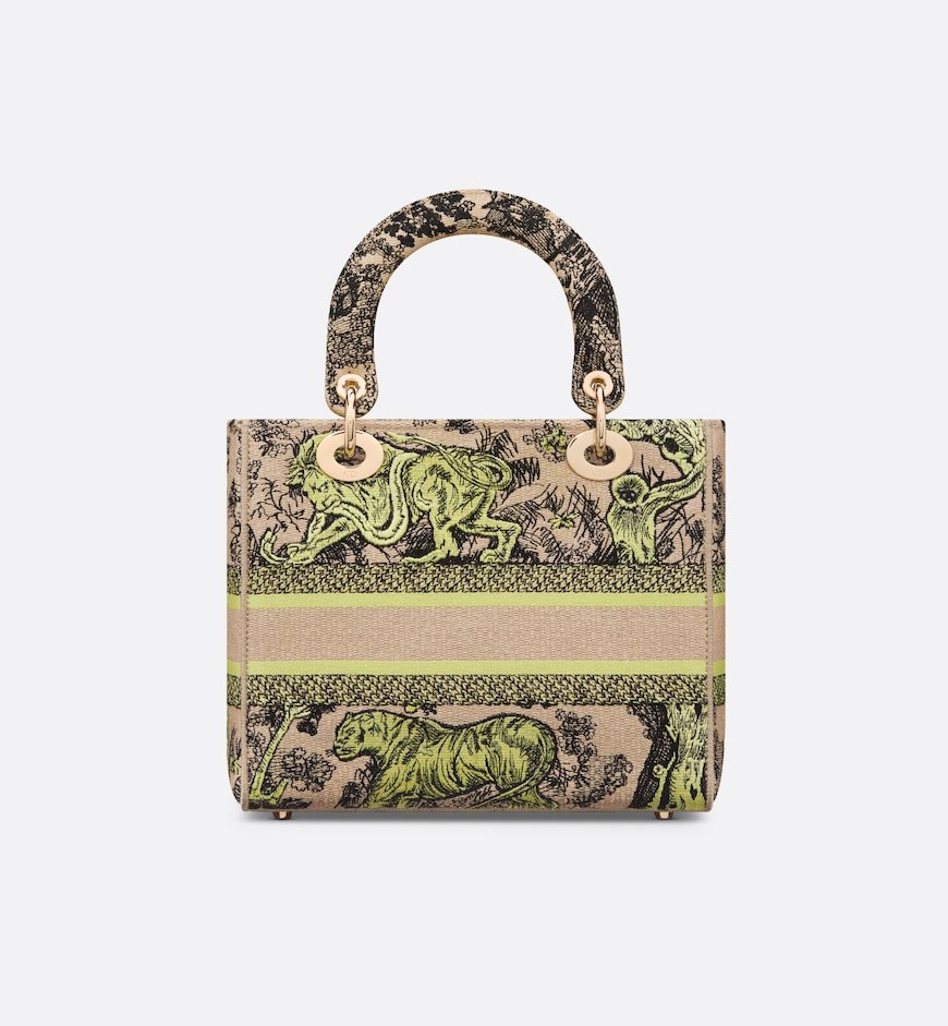 Part of the Dioriviera capsule, the Lady D-Lite bag combines classic elegance with House modernity. The raffia style is fully embroidered with the Toile de Jouy Sauvage motif in lemon yellow. The Christian Dior Paris signature adorns the front, while D.I.O.R. charms in pale gold-finish metal further enhance and highlight the silhouette. Featuring a wide, removable embroidered shoulder strap, the medium Lady D-Lite bag can be carried by hand or worn crossbody.
