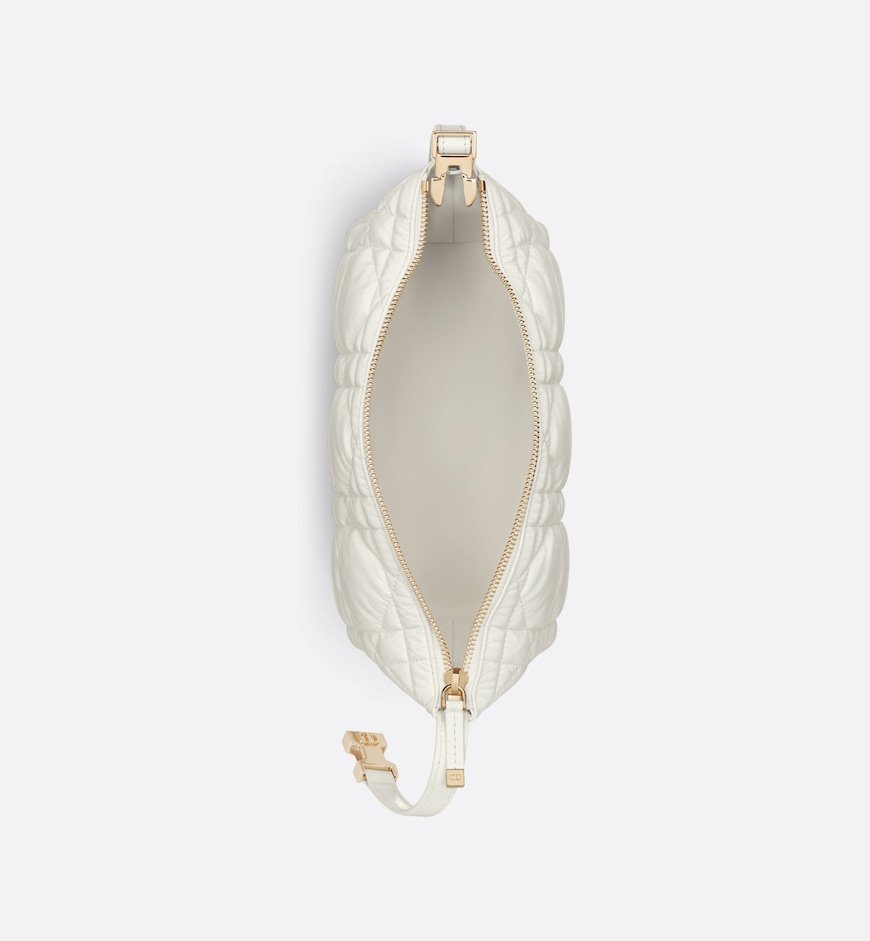 Maria Grazia Chiuri’s DiorTravel Nomad pouch is a modern hybrid design. Crafted in latte calfskin, it stands out with a unique Macrocannage quilted effect, and a spacious and flexible form that will accommodate all the essentials. The medium style can be carried by hand or worn over the shoulder thanks to the top handle, complete with a military-inspired pale gold-finish metal CD buckle, while one of the House’s embroidered shoulder straps can be attached to the side rings.