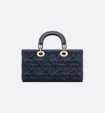 The Lady D-Joy bag captures the House’s vision of elegance and beauty by showcasing the iconic streamlined aesthetic of the Lady Dior line. Crafted in blue denim, the style features the Graphic Cannage motif, offering a modern 3D version of the House icon. Pale gold-finish metal D.I.O.R. charms embellish and illuminate its silhouette. Equipped with one removable chain strap and another adjustable and detachable leather strap, the medium Lady D-Joy bag can be carried by hand, worn over the shoulder or crossbody as a daily companion.