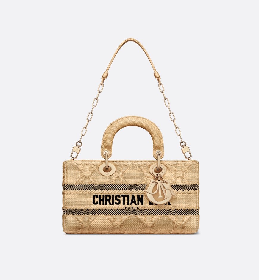 The Lady D-Joy bag captures the House’s vision of elegance and beauty. Refined and sleek, this timeless style showcases the iconic streamlined aesthetic of the Lady Dior line. Crafted in natural raffia with Cannage stitching, it is enhanced by the Christian Dior Paris signature and pale gold-finish metal D.I.O.R. charms embellishing its silhouette. Featuring one detachable chain strap and another adjustable and removable leather strap, the medium Lady D-Joy bag can be carried by hand, worn over the shoulder or crossbody as a daily companion.