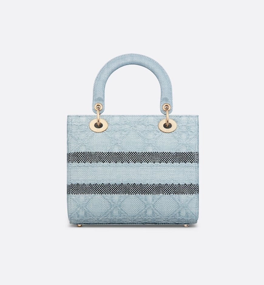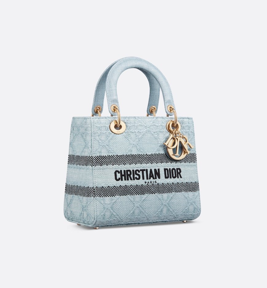 The Lady D-Lite bag combines classic elegance with House modernity. Crafted in sky blue raffia, it showcases hallmark Cannage stitching. A Christian Dior Paris signature adorns the front, while D.I.O.R. charms in pale gold-finish metal embellish and illuminate the silhouette. Featuring a wide, removable and reversible embroidered shoulder strap, the medium Lady D-Lite bag can be carried by hand or worn crossbody.