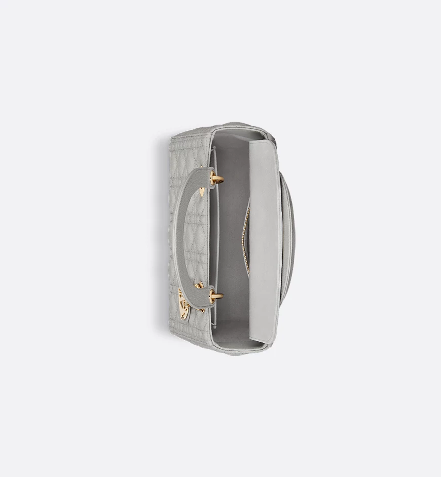 The Lady Dior bag epitomizes Dior’s vision of elegance and beauty. Sleek and refined, the timeless style is crafted in cloud gray grained calfskin with Cannage stitching, creating the unmistakable quilted texture. Pale gold-finish metal D.I.O.R. charms embellish and illuminate its silhouette. The medium Lady Dior bag features a thin, removable leather strap and can be carried by hand or worn crossbody.