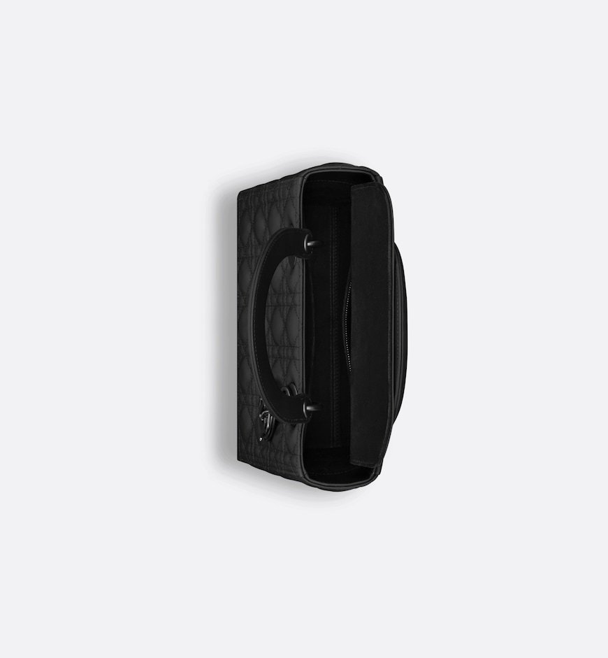 The Lady Dior bag epitomizes the House’s vision of elegance and beauty. Sleek and refined, the timeless yet relevant style is crafted in black ultramatte calfskin with Cannage stitching, creating the instantly recognizable quilted texture. The tonal metal D.I.O.R. charms complete and illuminate the silhouette. Featuring a thin, removable leather strap, the medium Lady Dior bag can be carried by hand, worn over the