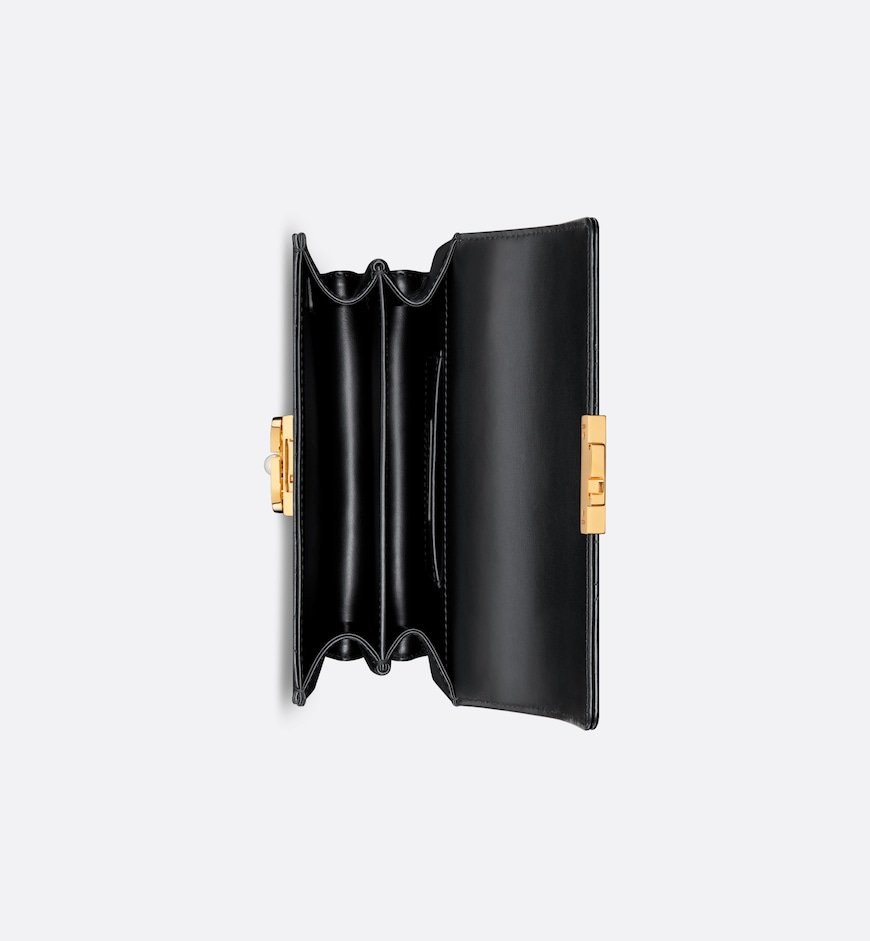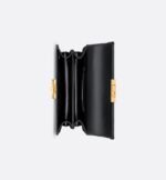 New for Fall 2024, the Dior Ange bag embodies the new House line with a resolutely modern and elegant aesthetic. Constructed in black calfskin with Macrocannage stitching, it is distinguished by its structured top handle in antique gold-finish metal engraved with the Christian Dior Paris signature and its flap with a CD clasp embellished with a resin pearl. The gusseted silhouette reveals two spacious compartments and a slip pocket to hold all the essentials. Completed by an adjustable and removable CD link chain in gold-finish metal accented by resin pearls, the miniature refined bag can be carried by hand, worn over the shoulder or crossbody.
