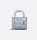 The Lady Dior bag epitomizes the House’s vision of elegance and beauty. Sleek and refined, the timeless style is crafted in pale blue lambskin with Cannage stitching, creating the unmistakable quilted texture. Pale gold-finish metal D.I.O.R. charms embellish and illuminate its silhouette. The miniature Lady Dior bag features a removable chain strap that allows it to be carried by hand or crossbody as an ideal