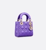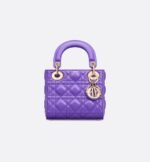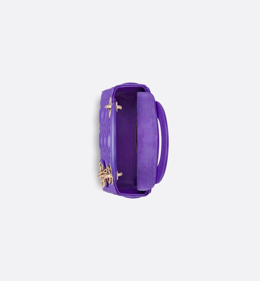 The Lady Dior bag epitomizes the House’s vision of elegance and beauty. Sleek and refined, the timeless style is crafted in purple lambskin with Cannage stitching, creating the unmistakable quilted texture. Pale gold-finish metal D.I.O.R. charms embellish and illuminate its silhouette. Equipped with a removable chain strap, the miniature Lady Dior bag can be carried by hand or worn crossbody as an ideal