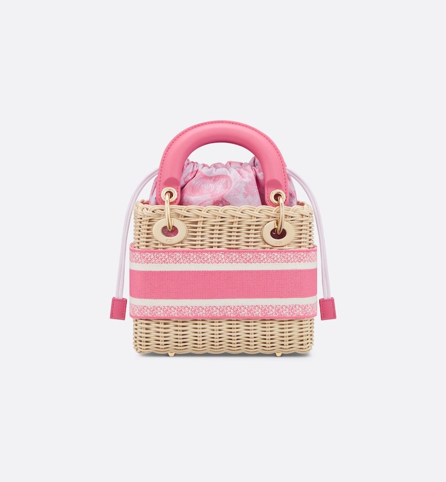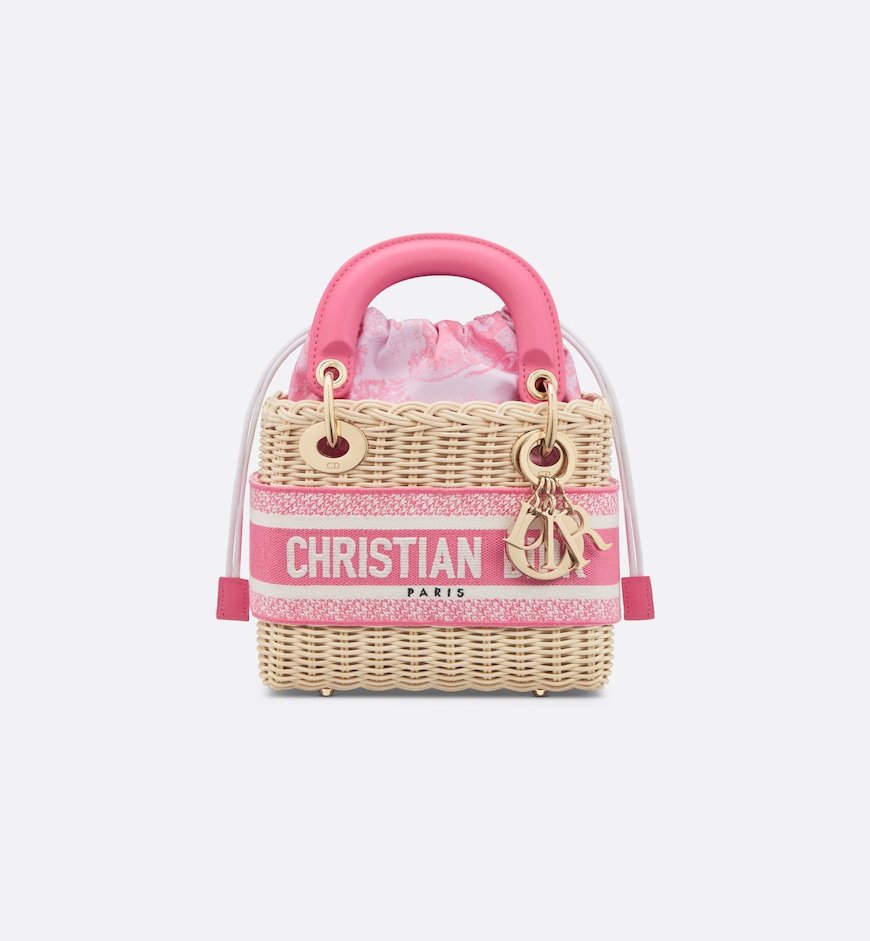 Part of the Dioriviera capsule, the Lady Dior bag epitomizes Dior’s vision of elegance and beauty. Sleek and refined, the timeless style exemplifies House savoir-faire with handwoven natural wicker. It features leather top handles and an interior drawstring pouch in candy pink Toile de Jouy jacquard. The embroidered Christian Dior Paris band, inspired by the Dior Book Tote, and pale gold-finish metal D.I.O.R. charms illuminate the silhouette. A wide, removable embroidered strap allows the miniature bag to be carried by hand, worn over the shoulder or crossbody.z`