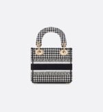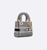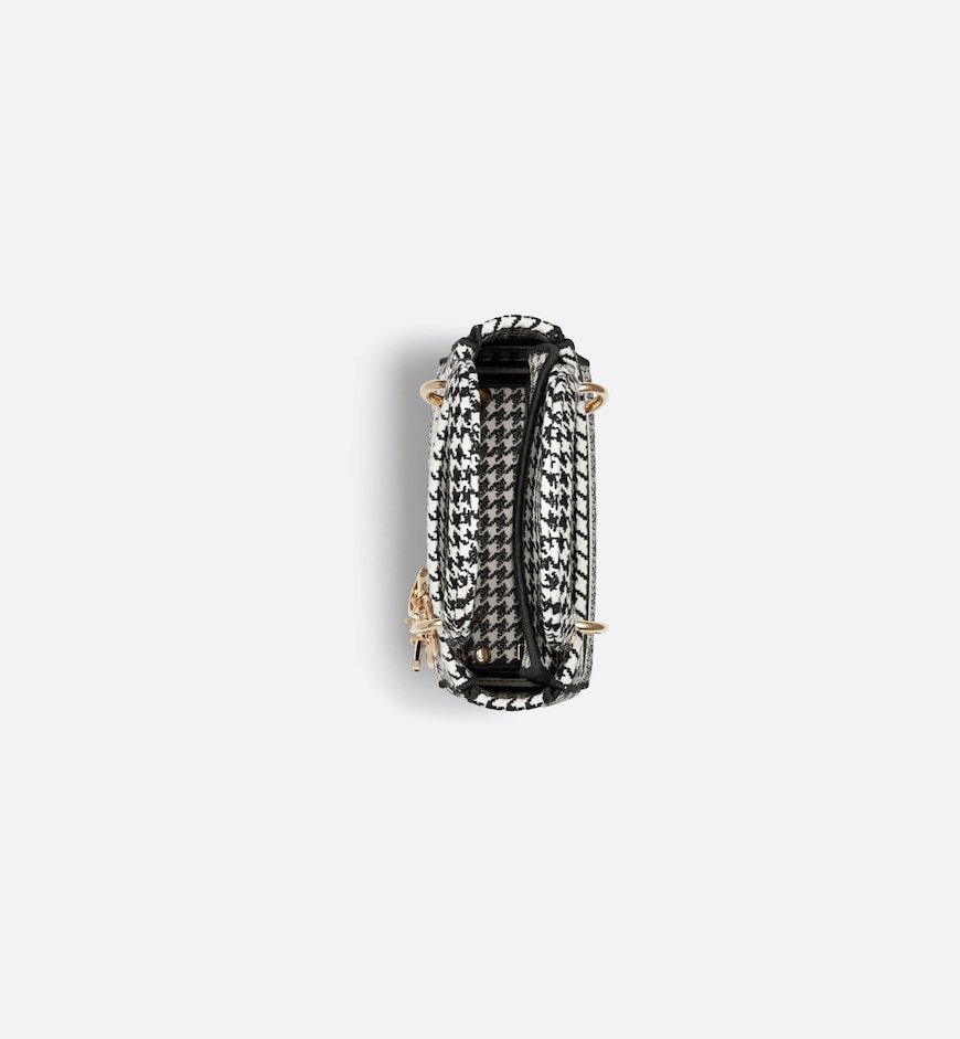 The Lady D-Lite bag combines classic elegance with House modernity. The style is fully embroidered with the black and white Houndstooth motif. A Christian Dior Paris signature accents the front, while pale gold-finish metal D.I.O.R. charms embellish and illuminate the silhouette. Equipped with a wide, reversible and removable embroidered shoulder strap, the miniature Lady D-Lite bag can be carried by hand or worn crossbody.