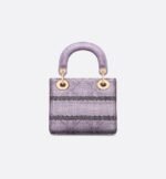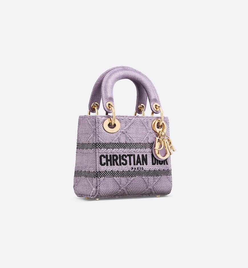 The Lady D-Lite bag combines classic elegance with House modernity. Crafted in lilac raffia, it showcases hallmark Cannage stitching. A Christian Dior Paris signature adorns the front, while D.I.O.R. charms in pale gold-finish metal embellish and illuminate the silhouette. Featuring a thin, removable and reversible embroidered shoulder strap, the miniature Lady D-Lite bag can be carried by hand or worn crossbody.