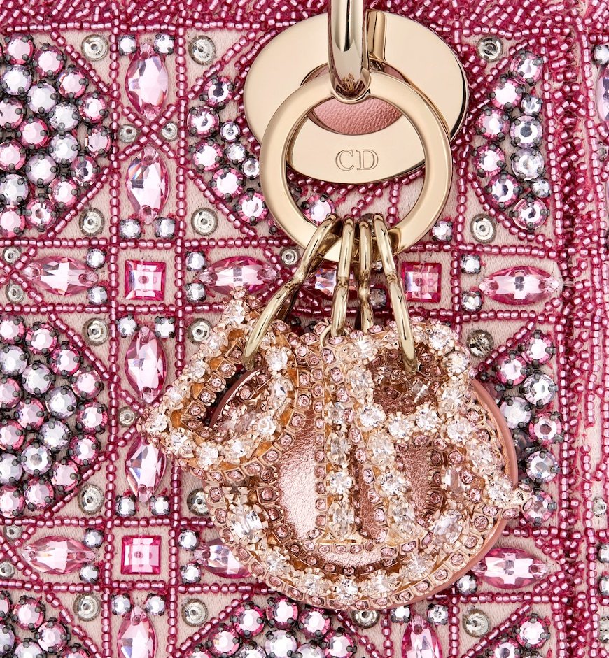 The Lady Dior bag epitomizes Dior’s vision of elegance and beauty. It demonstrates the House’s unique leather craftsmanship and is offered in Rose des Vents satin, embroidered with a multitude of resin pearls in a hallmark Cannage-motif design, while the handles are crafted in tonal metallic calfskin. The pale gold-finish metal D.I.O.R. charms are adorned with white crystals and further embellish its silhouette. The miniature style, with its removable chain shoulder strap, can be carried by hand or worn crossbody and will be the ideal evening wear companion.