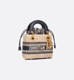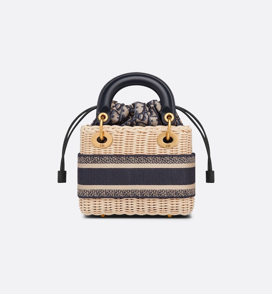 The Lady Dior bag epitomizes Dior’s vision of elegance and beauty. Sleek and refined, the timeless style exemplifies the House savoir-faire with hand-woven natural wicker. Featuring leather handles and an interior drawstring pouch in blue Dior Oblique jacquard, the design is enhanced by an embroidered Christian Dior signature band, inspired by the Dior Book Tote. A wide, removable embroidered strap allows the miniature bag to be carried in the hand, over the shoulder or crossbody.