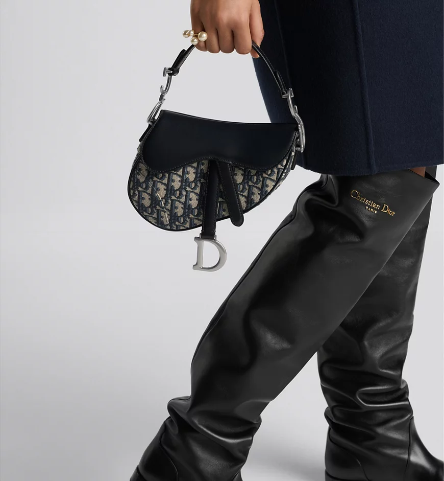 Maria Grazia Chiuri brings a fresh update to the iconic Saddle bag. The legendary design pairs the blue Dior Oblique jacquard with a tonal smooth calfskin Saddle flap with a D stirrup strap and magnetic pull, as well as an antique silver-finish metal CD signature on either side of the handle. Equipped with a thin, adjustable and removable strap, the miniature Saddle bag may be carried by hand, worn over the shoulder or crossbody.