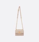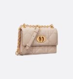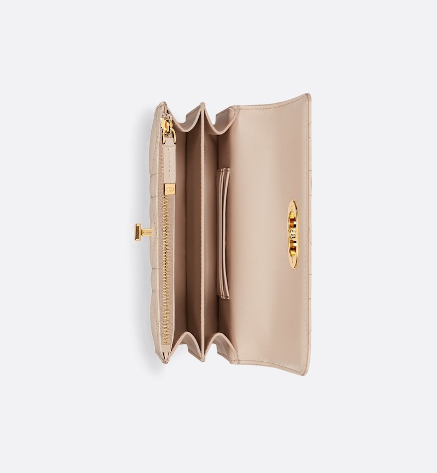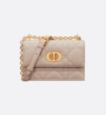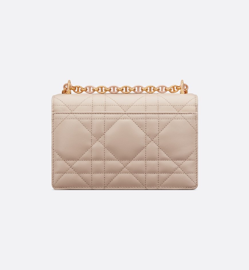 The new Fall 2023 Miss Caro mini bag enhances the Dior Caro line with modern and timeless elegance. Crafted in caramel beige lambskin, it stands out with the unique quilted effect of Macrocannage stitching, as well as a flap accented by a gold-finish metal CD twist clasp inspired by the seal of a Christian Dior perfume bottle. Alternating between gold-finish metal links and tonal enamel links that match the leather, the adjustable chain shoulder strap has a leather insert for added comfort when carrying the bag by hand, wearing it over the shoulder or crossbody.