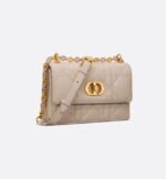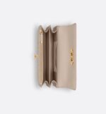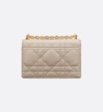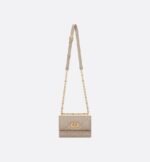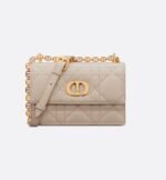 The Miss Caro mini bag enhances the Dior Caro line with modern and timeless elegance. Crafted in powder beige lambskin, it stands out with the unique quilted effect of Macrocannage stitching, as well as a flap accented by a gold-finish metal CD twist clasp inspired by the seal of a Christian Dior perfume bottle. Alternating between gold-finish metal links and tonal enamel links that match the leather, the adjustable chain shoulder strap has a leather insert for added comfort when carrying the bag by hand, wearing it over the shoulder or crossbody.