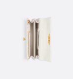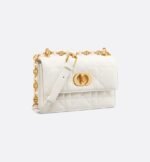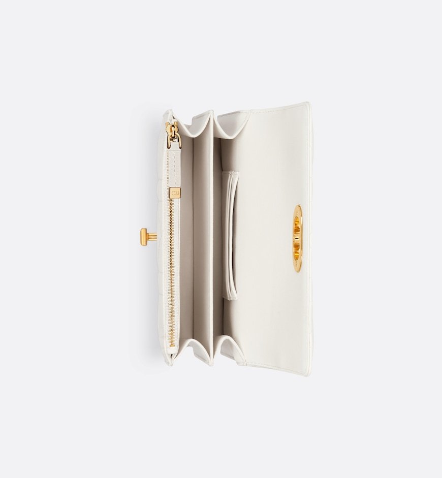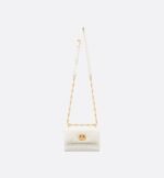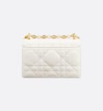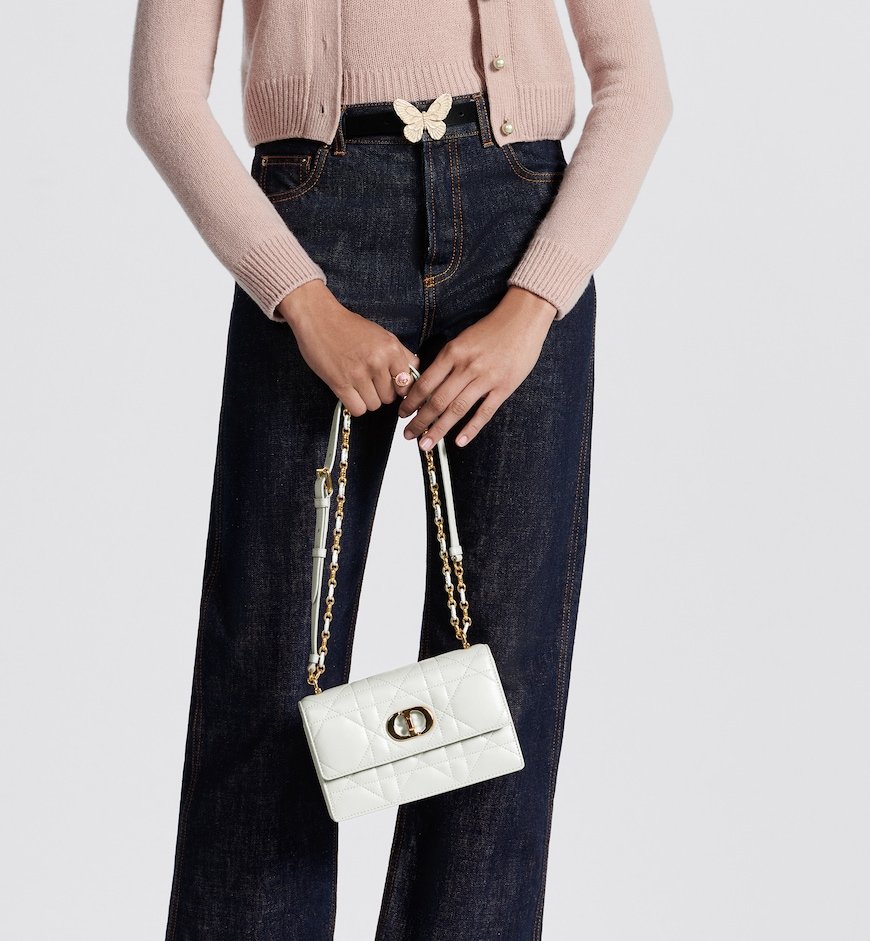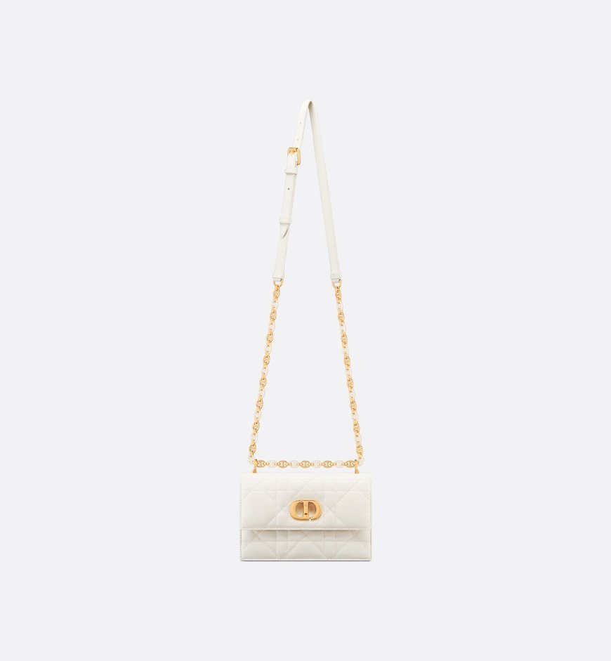 The new Fall 2023 Miss Caro mini bag enhances the Dior Caro line with modern and timeless elegance. Crafted in latte lambskin, it stands out with the unique quilted effect of Macrocannage stitching, as well as a flap accented by a gold-finish metal CD twist clasp inspired by the seal of a Christian Dior perfume bottle. Alternating between gold-finish metal links and tonal enamel links that match the leather, the adjustable chain shoulder strap has a leather insert for added comfort when carrying the bag by hand, wearing it over the shoulder or crossbody.