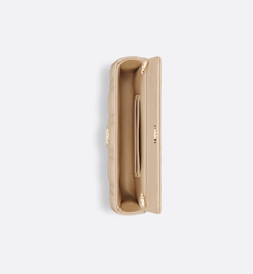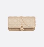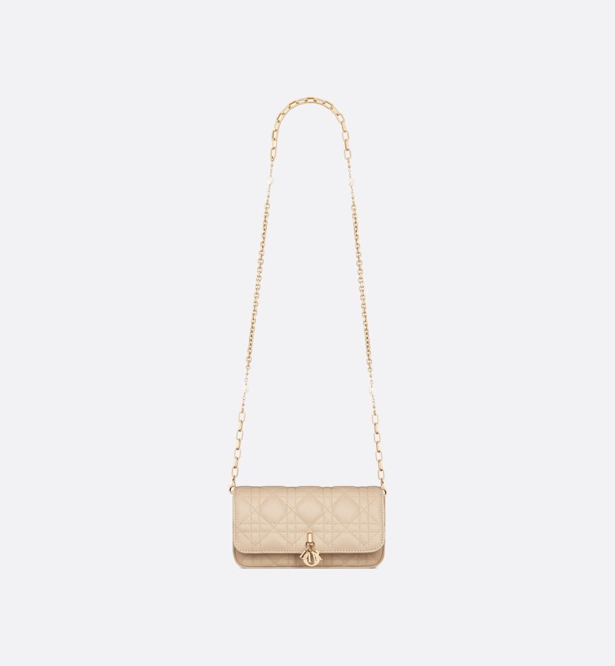 The My Dior – Dior Talk Phone Pouch is a clever and sophisticated creation. Crafted in powder beige Cannage lambskin, it features pale gold-finish metal D.I.O.R. charms. Completed by an elegant removable chain punctuated with resin pearls, the phone pouch can be carried by hand, worn over the shoulder or crossbody.