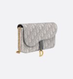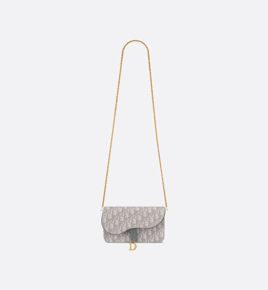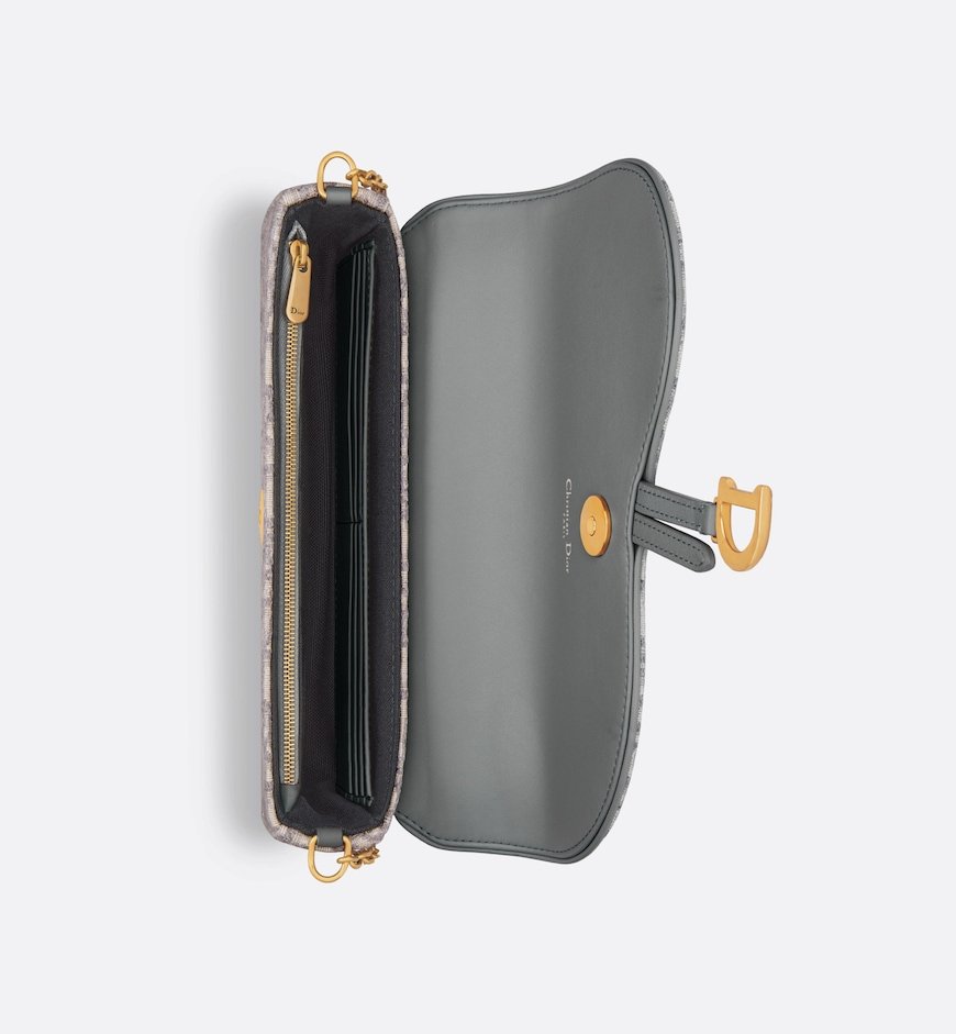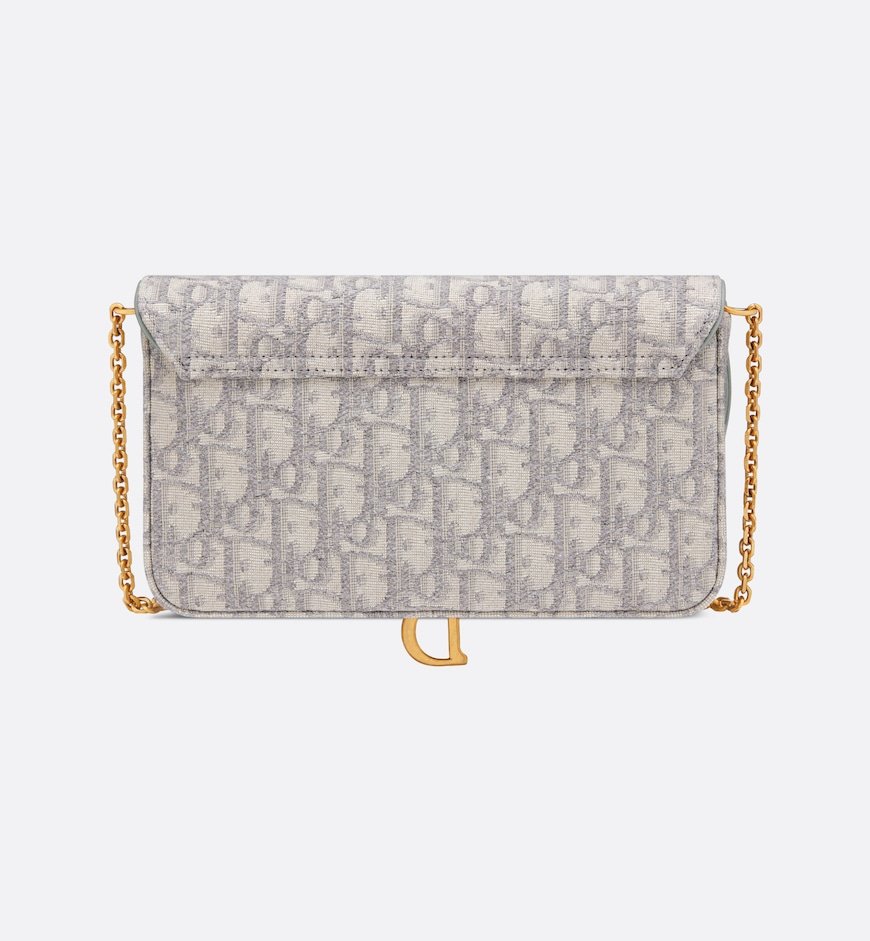 The Saddle pouch with chain is a modern and practical creation with smooth and harmonious lines. Crafted in gray Dior Oblique jacquard, it features an asymmetric flap and an antique gold-finish metal D stirrup. The spacious interior will accommodate any essentials, while the chain allows it to be worn over the shoulder or crossbody. The pouch can be ideally paired with other Saddle creations.