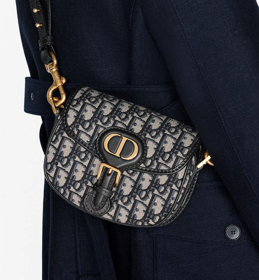 The Dior Bobby bag is a hobo style showcasing sophisticated lines and harmonious proportions. The silhouette is crafted in blue Dior Oblique jacquard and is enhanced by antique gold-finish metal hardware. Featuring a removable and adjustable sliding shoulder strap with a military-inspired buckle, the small Dior Bobby bag can be carried by hand, worn over the shoulder or crossbody.