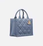 Maria Grazia Chiuri’s hallmark Dior Book Tote is presented in an elegant new variation. Crafted in denim blue calfskin, the design showcases the Macrocannage motif and is embellished with pale gold-finish metal D.I.O.R charms. The cashmere leather interior reveals a zip pocket and slip pockets, ideal for organizing all the daily essentials. Featuring an adjustable and removable strap, the lightweight and practical small tote exemplifies Dior savoir-faire and may be carried by hand or worn over the shoulder.