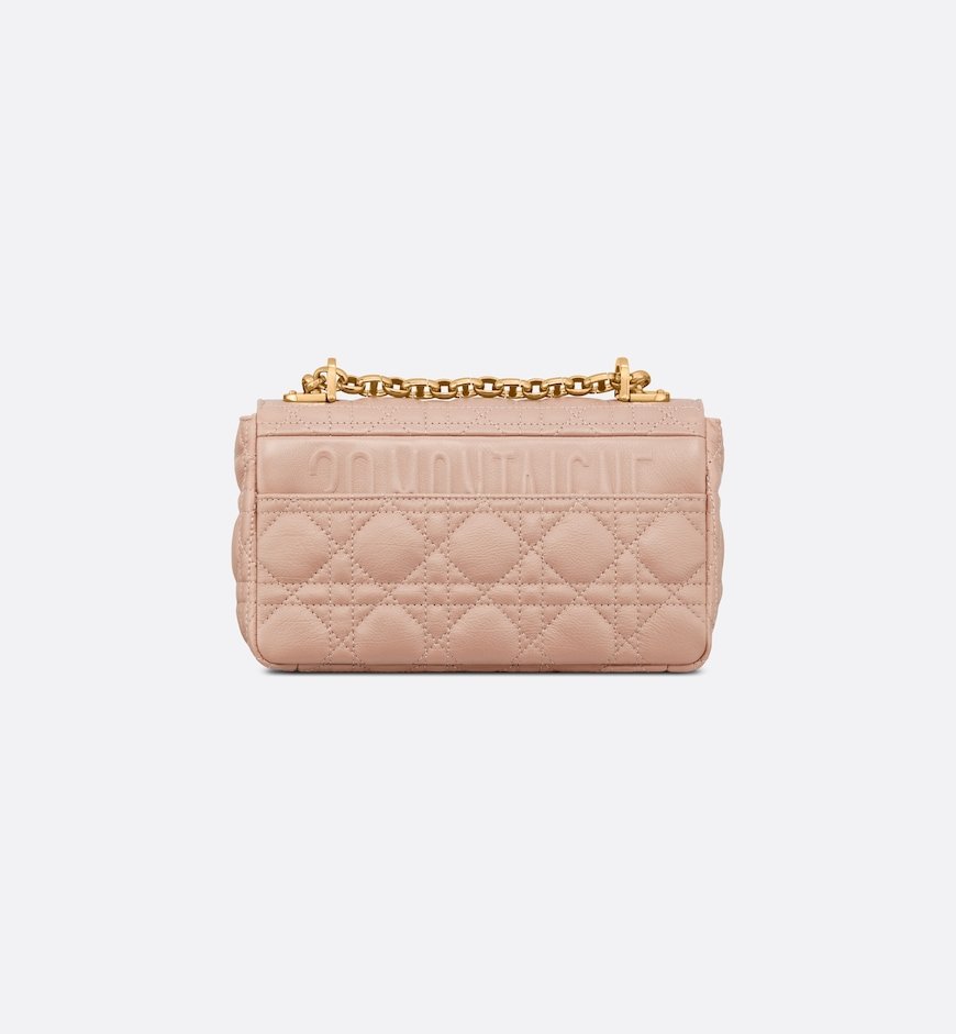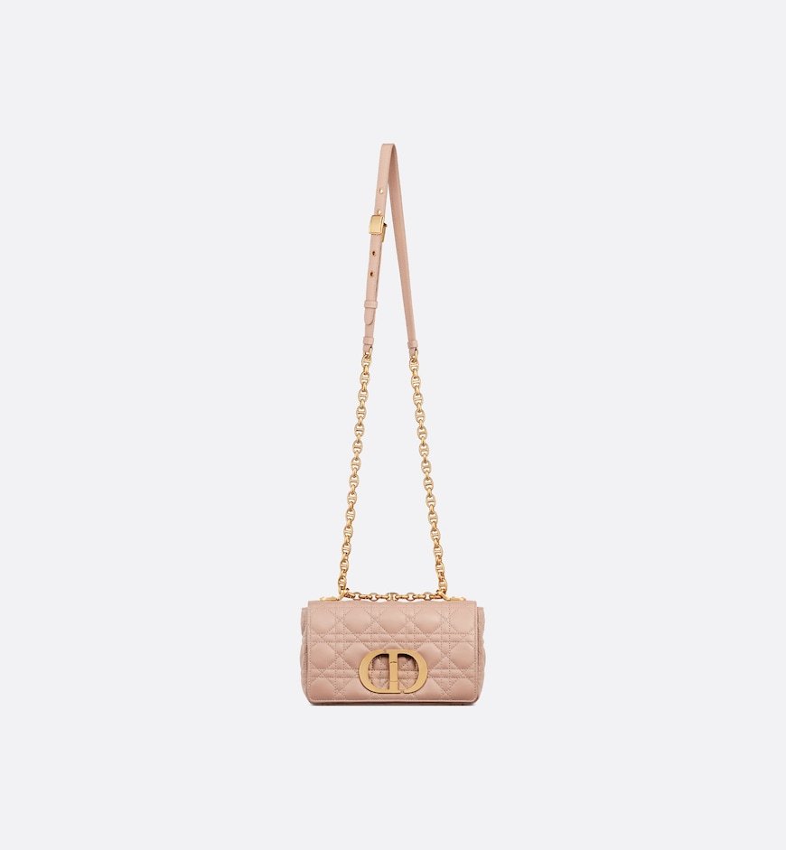 The DiorCaro bag combines modernity with timeless elegance. The silhouette is crafted in Rose des Vents supple calfskin with Cannage topstitching. The bag features a flap adorned with an antique gold-finish metal CD twist clasp, inspired by the seal of a ChristianDior perfume bottle. The detachable chain shoulder strap with CD signature links allows the small bag to be carried by hand, worn over the shoulder or crossbody and may be replaced by one of the House’s wide embroidered straps for day or evening attire.