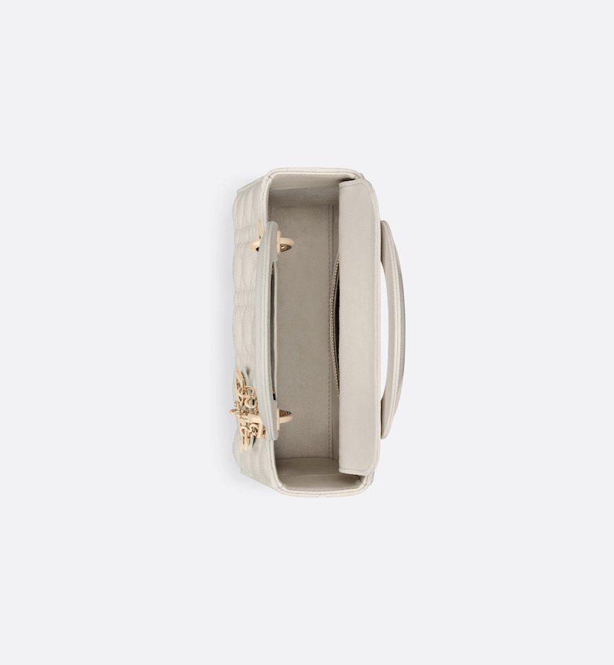 The Lady Dior bag embodies the House’s vision of elegance and beauty. Sleek and refined, the timeless style is crafted in latte grained calfskin with Cannage stitching, creating the instantly recognizable quilted texture, while the pale gold-finish metal D.I.O.R. charms further embellish its silhouette. Featuring a thin, removable leather shoulder strap, the small Lady Dior bag can be carried by hand or worn