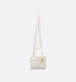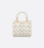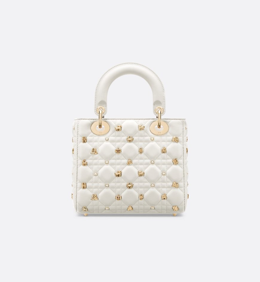 The Lady Dior My ABCDior bag epitomizes Dior’s vision of elegance and beauty. Sleek and refined, the creation is timeless. Constructed in latte Cannage lambskin, the bag is accented by gold-tone resin pearls and gold-finish zodiac sign studs. Pale gold-finish metal D.I.O.R. charms embellish and illuminate the silhouette. The unique, small design may be personalized with badges placed on its shoulder strap and can be carried by hand or worn crossbody.