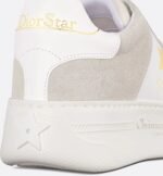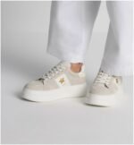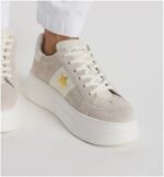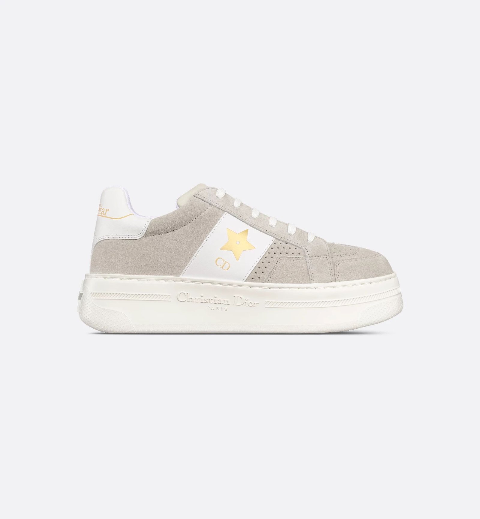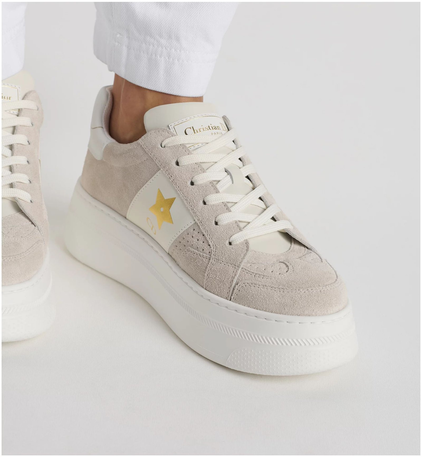 The Dior Star sneaker is a modern creation. Crafted in light beige suede calfskin, it is accented by white calfskin panels, adorned with the gold-finish CD signature and star on the sides. Completed by a thick, ultralightweight signature sole, the sneaker can be paired with laid-back outfits year-round.